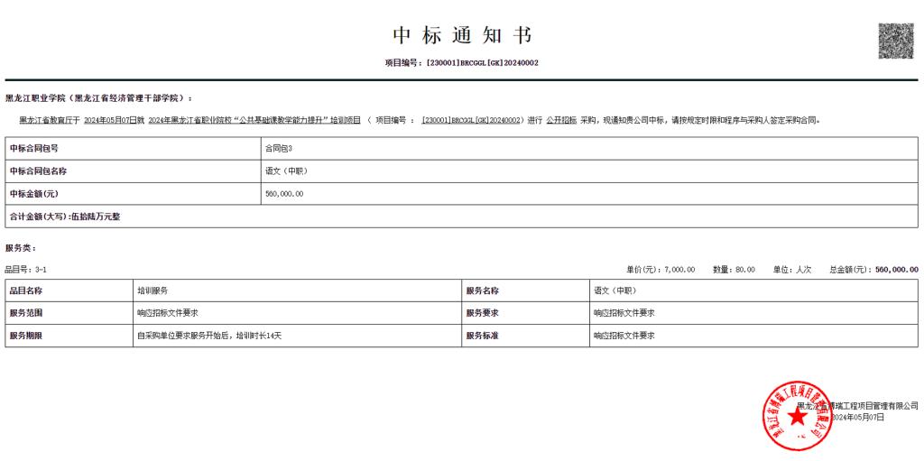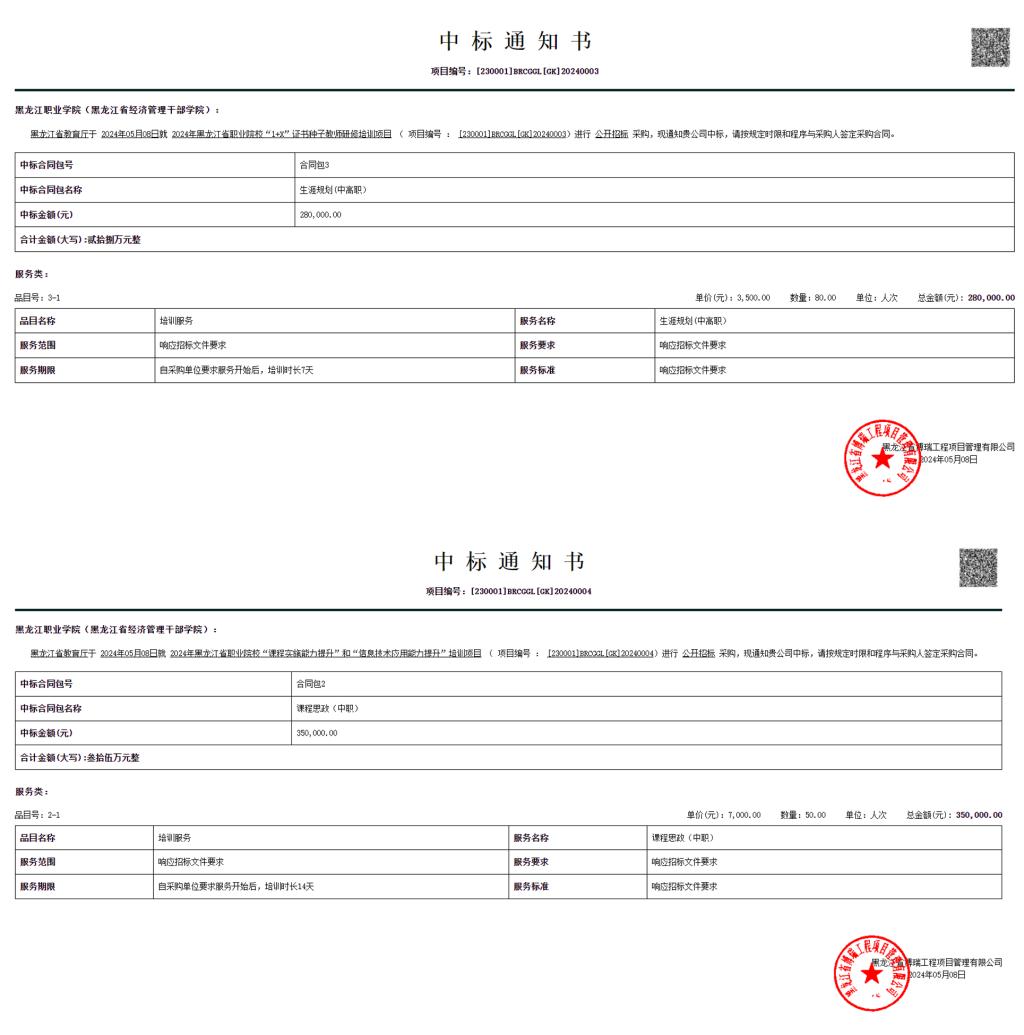 5月8日,贝博官网参加2024年黑龙江省职业院校“课程实施能力提升”和“信息技术应用能力提升”培训项目、2024年黑龙江省职业院校“1+X”证书种子教师研修培训项目、2024年黑龙江省职业院校“公共基础课教学能力提升”培训项目竞标,凭借良好的学校声誉及科学的项目方案顺利中标语文(中职)、生涯规划(中高职)、课程思政(中职),中标金额119万元。