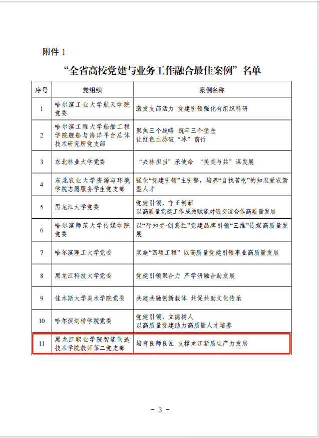 近日,黑龙江省委教育工委公布了全省高校党建与业务融合案例评选结果,学校智能制造技术学院教师第二党支部成功入选全省高校党建与业务融合最佳案例,是我省唯一入选的高职院校。