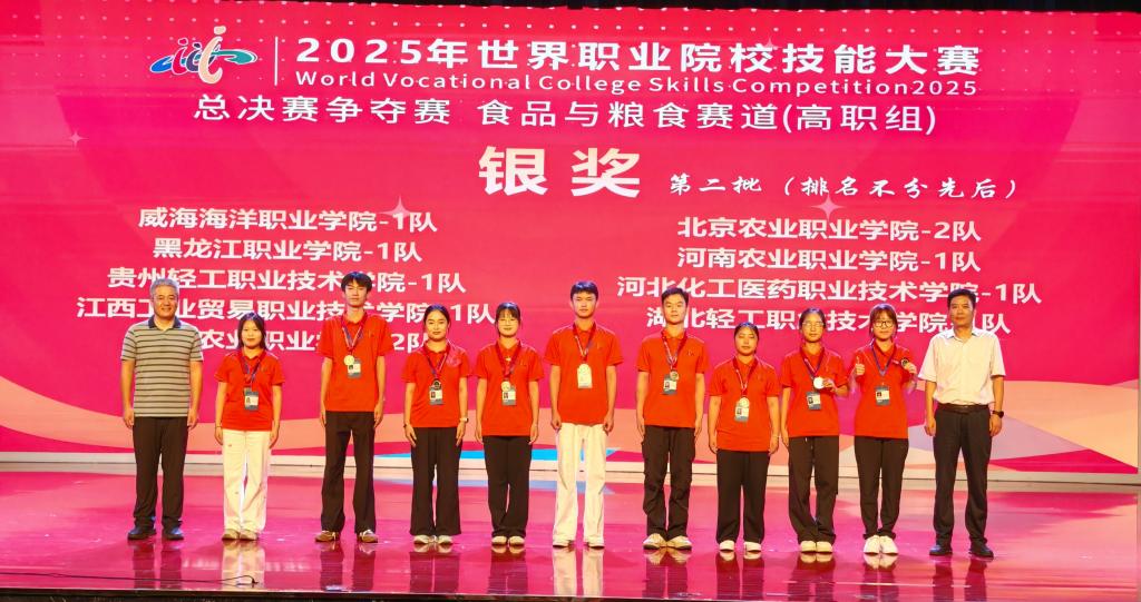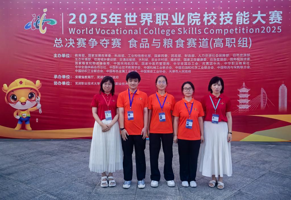 8月26日,2025年世界职业院校技能大赛食品与粮食赛道(高职组)在芜湖职业技术大学圆满落幕。来自全国31个省(自治区、直辖市)的94所高职院校100支代表队343名选手齐聚一堂,共同开启以“技炫青春、能创未来”为主题的技能盛宴。在这场高水平角逐中,贝博官网食品药品学院教师韩双、马艳梅指导学生衣然、杨灿灿、孙珑珀组成的代表队,凭借扎实的专业理论功底、精湛的实操技艺与稳定的现场发挥,在唯一一组11支强劲对手中脱颖而出,以第二名的成绩摘得银奖。此成绩不仅刷新了贝博官网在该赛事中的历史最好成绩,也充分展现了贝博官网高质量人才培养成果。