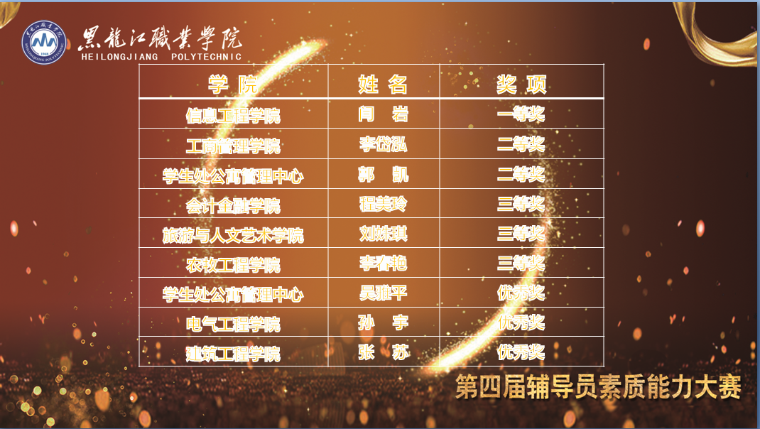 本次大赛于11月初启动,从动员部署,到初赛、决赛,历时一个多月。为强化以赛代训的作用,特邀第八届黑龙江省辅导员素质能力大赛一等奖获得者邵明琛、二等奖获得者卢丙洋为选手进行初赛、复赛培训。经过笔试和宣讲对谈两个环节的角逐,9名辅导员进入决赛。决赛通过案例分析研讨和谈心谈话两个环节,考察了辅导员教育引导、解决问题等综合能力。决赛中,辅导员们沉着冷静、妙语连珠,展现了敏锐的思维和优秀的分析能力,赢得了评委的充分肯定。经过激烈的角逐,最终信息工程学院辅导员闫岩荣获一等奖,工商管理学院辅导员李岱泓、学生处公寓辅导员郭凯荣获二等奖,会计金融学院辅导员程美玲、旅游与人文艺术学院辅导员刘姝琪、农牧工程学院辅导员李春艳荣获三等奖,学生处公寓辅导员吴雅平、电气工程学院辅导员孙宇、建筑工程学院辅导员张苏荣获优秀奖。