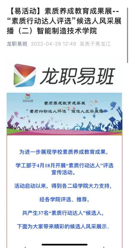 在为期一个月的活动中,全校师生广泛参与,通过二级学院选送、线上专家评选、网络投票、微信平台展播等形式,共展出学校各二级学院素质养成教育成果9个,评选出2022年“素质行动达人”18名,提名奖19名。本次活动在校易班公众号推文累计浏览超过14400人次,“素质行动达人”评选网络投票6615人次,充分展现了学校素质养成教育成果。