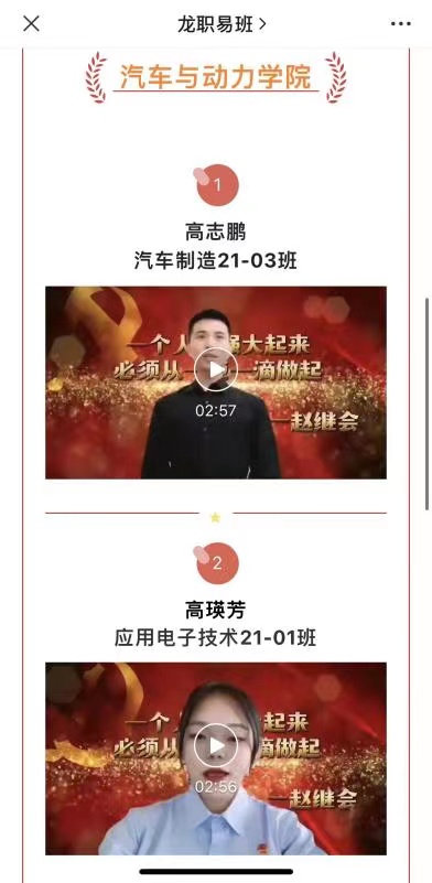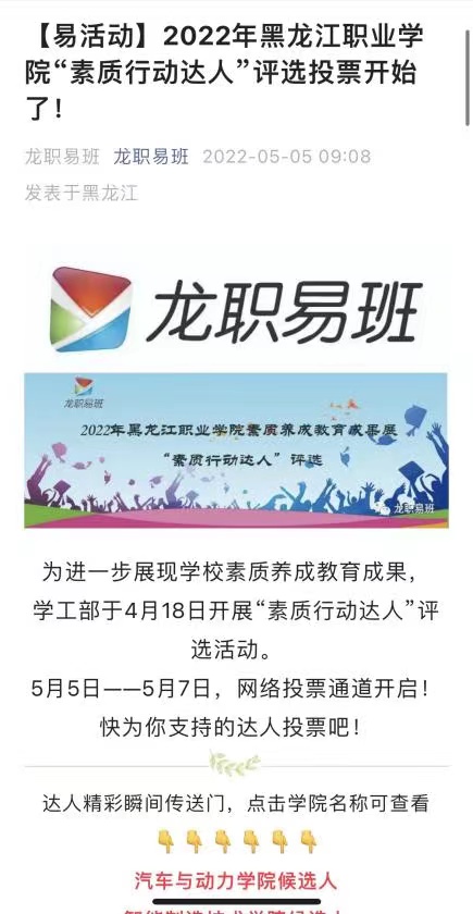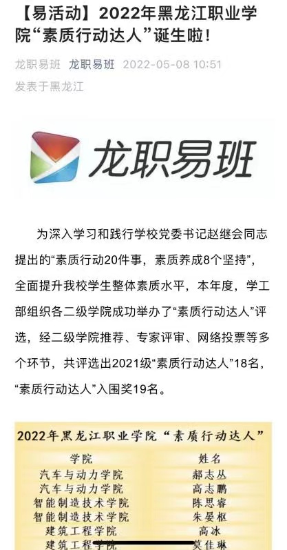 为进一步展现学校素质养成教育成果,营造积极向上、求实创新的学习氛围,引导学生养成良好习惯,促进学生素质全面提升,按照学校第七届“铺路石文化节”暨庆祝“龙职”成立10周年系列活动安排,4月18日——5月18日,学工部开展了“素质养成教育”成果征集、“素质行动达人”评选、二级学院“素质养成教育”成果展播等系列活动。