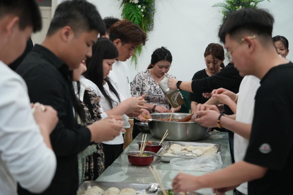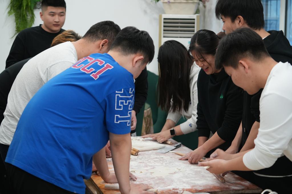 众人齐出手,争当“饺饺者”!择菜、调馅、擀面皮、包饺子,师生共同参与、相互配合、明确分工,用灵巧的双手,捏出了一个个“个性十足”的饺子。师生互教互学,相互切磋包饺子的技巧,现场气氛格外热闹。经过共同努力,“形状各异”的饺子摆满了餐桌,蘸点老陈醋,涮上辣椒油,一口咬下去,汤汁四溢,滋味鲜美,到处洋溢着“家”的味道与温馨。品尝美食之余,师生们围坐在一起,交流学习,分享生活,其乐融融。