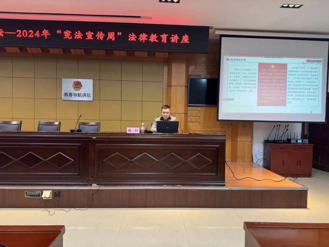 为深入学习宣传宪法,弘扬宪法精神,维护宪法权威,构建法治校园。在2024年“宪法宣传周”到来之际,贝博官网团委于12月4日下午18点,在清华楼九楼经济报告厅举办第61期“青春导航讲坛”2024年“宪法宣传周”法律教育讲座,让同学们能够更加深入地了解法律知识并增强法律意识。