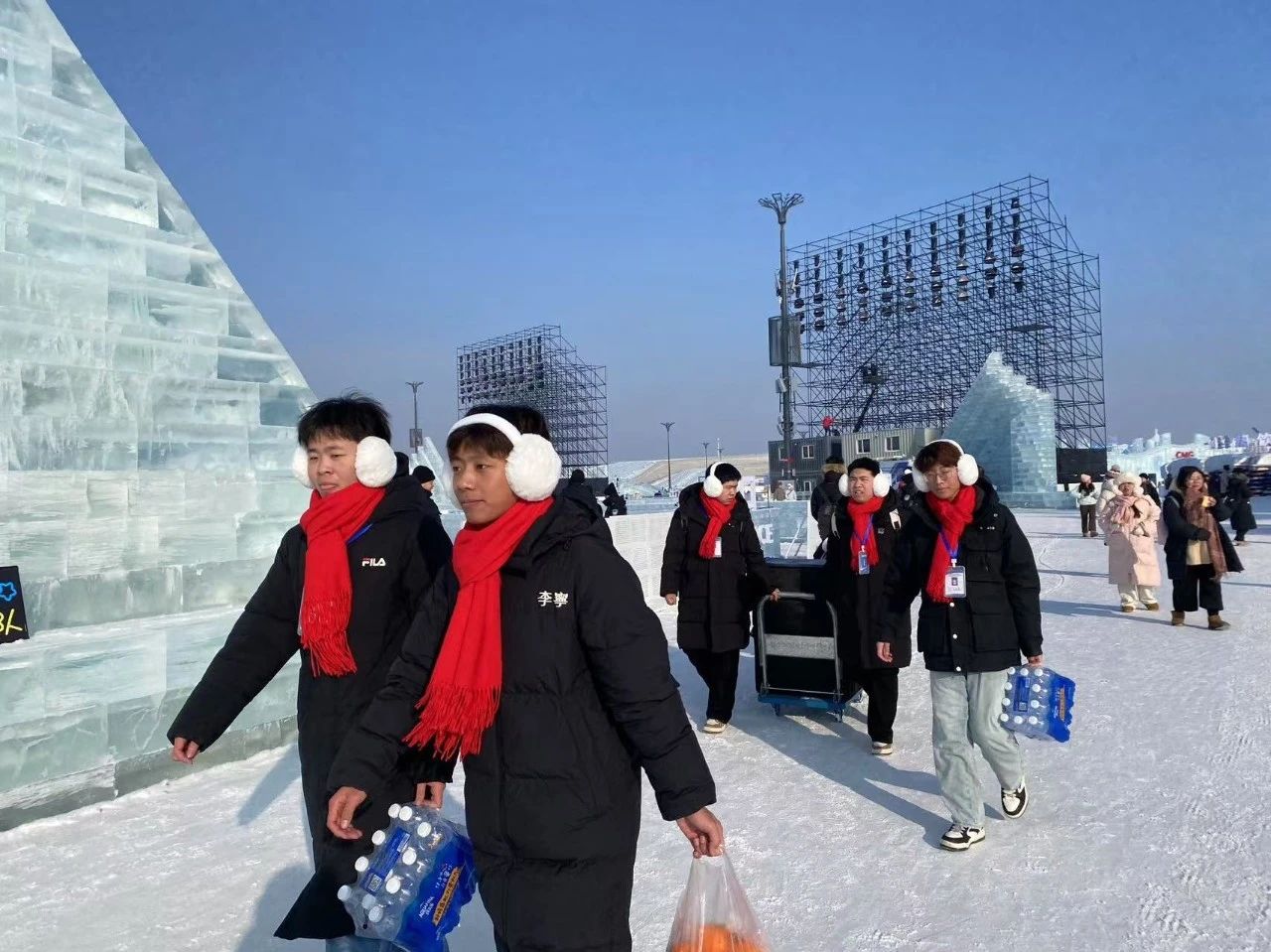 活动当日,志愿者们早早抵达冰雪大世界,迅速投入到紧张而有序的工作中。从31日上午10点直至次日凌晨,志愿者们始终坚守岗位,毫无怨言。他们的身影穿梭在冰雪大世界的每一个角落,肩负着协助演出的重任。从舞台布景的搭建与调整,到各类演出道具的搬运与摆放,每一个环节都有他们忙碌而专注的身影,沉重的道具在冰雪地面上拖行,只为确保每一场演出的道具都能精准就位。后台候场区域,同样有着志愿者们忙碌的身影,他们时刻准备着,为演员们提供所需的一切帮助。演出开始之后,志愿者们手拿荧光棒,热情地送到每一位观众手中,还不忘提醒大家注意安全,尽情享受这欢乐的时光。