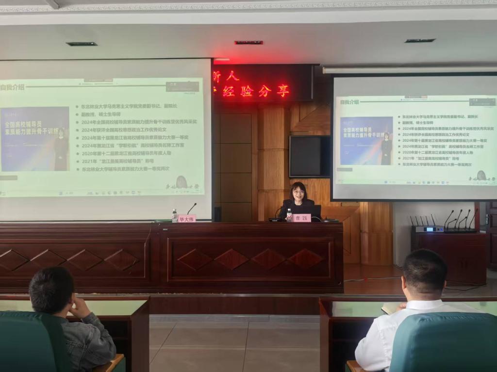 5 月 15 日上午,东北林业大学马克思主义学院党委副书记、副院长曹颖教授,为贝博官网辅导员带来题为《以赛促学强本领,以行践知育新人 —— 全国高校辅导员素质能力提升训练营经验分享》的讲座。学生工作部部长毕大伟、学生工作部党总支书记石倩、各二级学院党总支副书记、学管办主任,及全体辅导员、公寓辅导员参加此次培训。