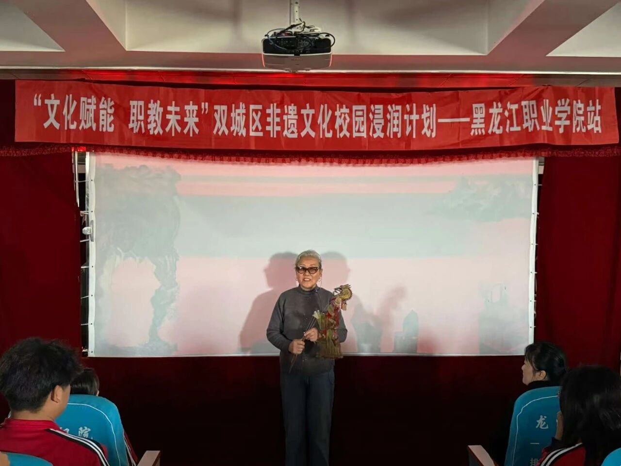 一块幕布,一束光影,数张精雕细琢的皮偶,伴着悠扬唱腔,演绎千年传奇——这,便是非遗皮影戏,被称为“有声电影的鼻祖”“中国最早的卡通”,它起于西汉,兴于唐代,盛于清代,承载着中华民族两千多年的历史记忆,是中华民族最古老的民间艺术之一,更是中国独有的民间艺术。其表演融合了唱腔、音乐、雕刻技艺。2007年,皮影戏被列入黑龙江省级非遗名录,是双城区域内首批被列入省级非遗名录的非遗项目。此次活动中,皮影戏省级代表性传承人徐桂文老师表演了《三打白骨精》以指尖为笔,以兽皮为卷,在光影交织的舞台上书写着神奇,“一口唱尽千古事,双手舞动百万兵。”师生们零距离感受到了皮影戏这一光影艺术的独特魅力