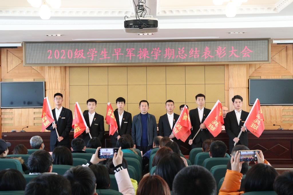 学生处副处长陈宇辉同志宣读2020-2021学年第一学期学生早军操评比表彰决定,共有30个班级获得了“军操标兵班”荣誉称号。