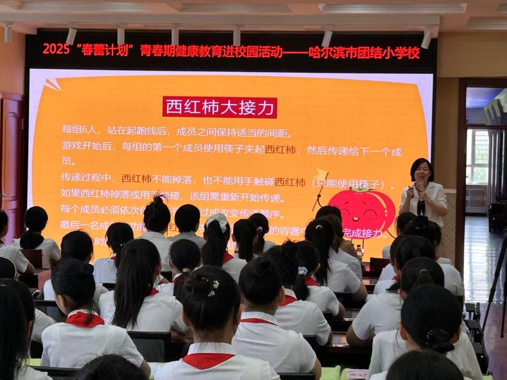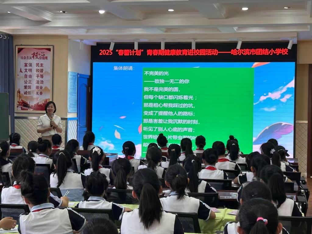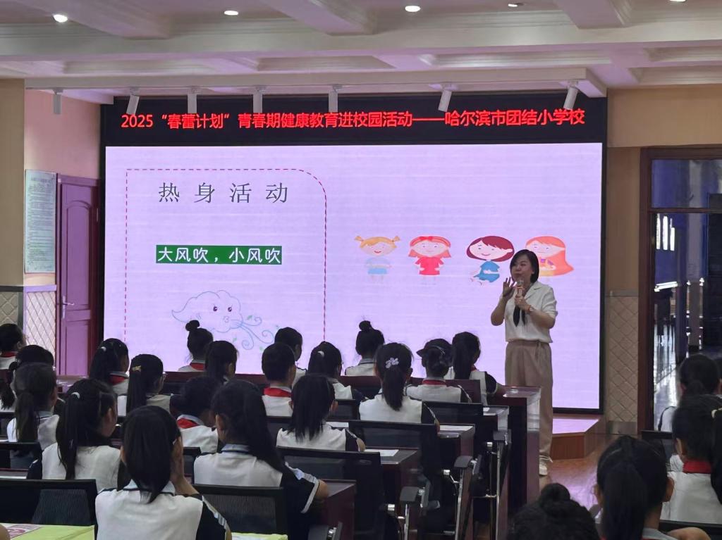 2025年5月30日上午,在黑龙江省妇女儿童基金会的邀请下,贝博官网心理健康教育咨询中心副主任蔡培培走进哈尔滨市团结中心小学校,为100多名女同学上了一堂生动的心理课,拉开了2025年“春蕾计划”青春期健康教育进校园活动的序幕。