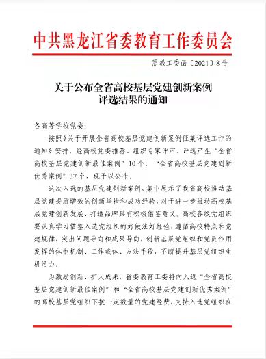 10月15日,黑龙江省委教育工委印发《关于公布全省高校基层党建创新案例评选结果的通知》。学校党委委派综合办公室党支部选送的《结“红色对子”,探索建立“党建合作社”》,经省委教育工委组织专家匿名评审,被评为“全省高校基层党建创新优秀案例”。近期优秀案例将汇编成册,供各高校学习借鉴。
