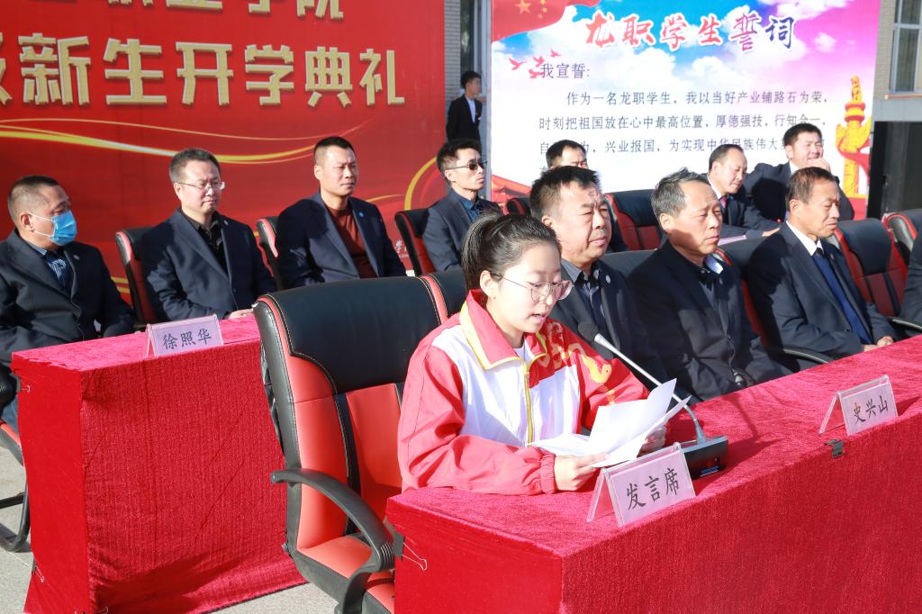 食品药品学院药品经营2020-02班学生李美林作为新生代表发言,她号召全体新同学掌握正确的学习方法,为终生学习做好准备。厚植优秀的道德修养,营造团结友爱的氛围。砥砺品格,博学笃志,发奋图强,就像“龙职精神”那样——自强有为,兴业报国。