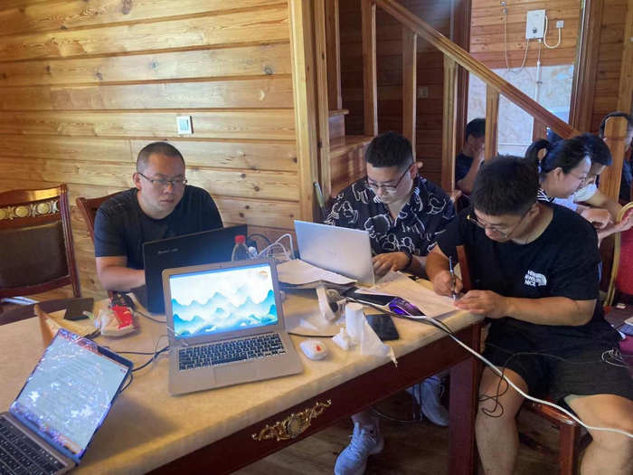 ▲“龙之禹·环净卫士-乡村生活垃圾无害化处理技术赋能者”项目指导教师闫亮与团队学生在暑期集训营期间打磨参赛项目