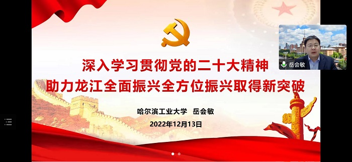 12月13日下午,黑龙江省教育系统学习贯彻党的二十大精神宣讲团为贝博官网宣讲党的二十大精神,哈尔滨工业大学党委宣传部常务副部长岳会敏以《深入学习贯彻党的二十大精神 助力龙江全面振兴全方位振兴取得新突破》为题,线上为全校师生进行了提纲挈领、条分缕析的讲解。副校长郑福贵主持会议。学校领导班子成员、全体处级干部和师生代表参加会议。