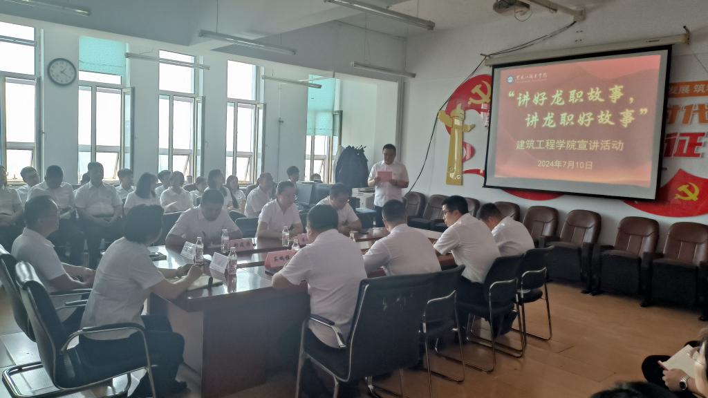 7月10日,建筑工程学院开展“讲好龙职故事,讲龙职好故事”宣讲会,学院领导班子及全体教职工参加宣讲会,宣讲会由学管办主任张钧铭主持。