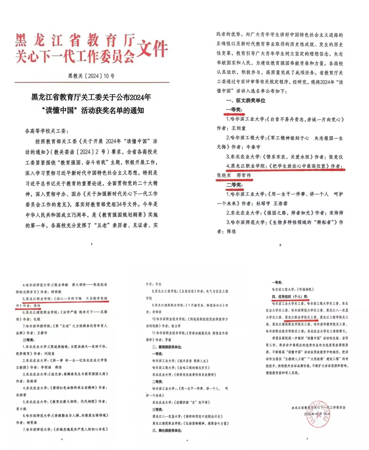 近日,省教育厅关工委先后下发《关于授予全省教育系统创建五好基层关工委优秀组织奖和先进集体称号的决定》和《黑龙江省教育厅关工委关于公布2024年 “读懂中国”活动获奖名单的通知》,贝博官网关工委在两项活动中表现突出,喜获佳绩。