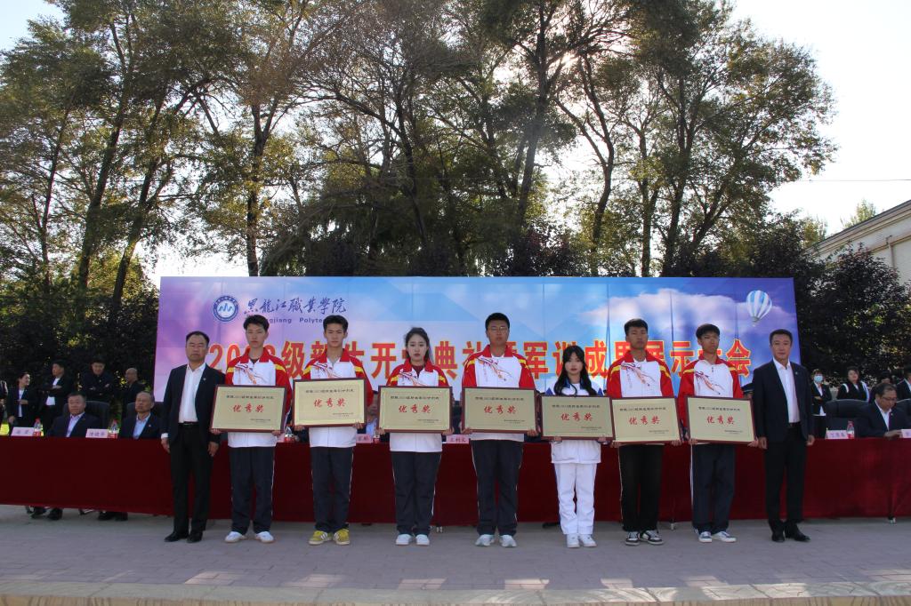张金龙表示,“龙职”学子们高质量、高标准地完成为期19天的军事技能训练。通过军训,同学们树立了高度的集体荣誉感,磨炼了坚毅的意志品质,展示了青春向上的活力和斗志昂扬的精神,希望同学们把这次军训取得的成果转化为努力学习、刻苦钻研的强大精神动力,进一步提升思想意识,增强身体素质。李伟宣读了《关于表彰2023级新生军训先进集体的决定》,学校领导为受到表彰集体颁奖。