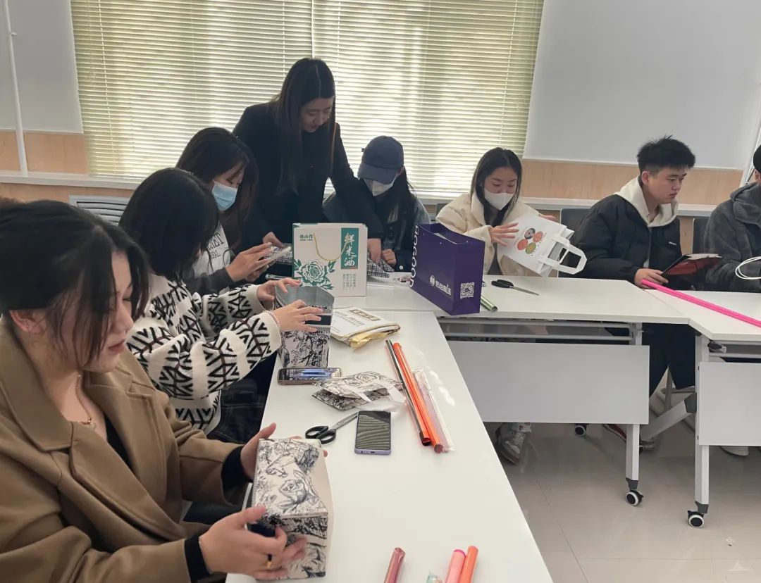 随后,张嘉馨老师带领同学们动手自制收纳工具,将生活中随处可见的快递盒、奶茶袋等变成收纳神器,同学们分为几个小组结合所学习到的收纳技巧,发挥想象力现场制作,气氛活跃。