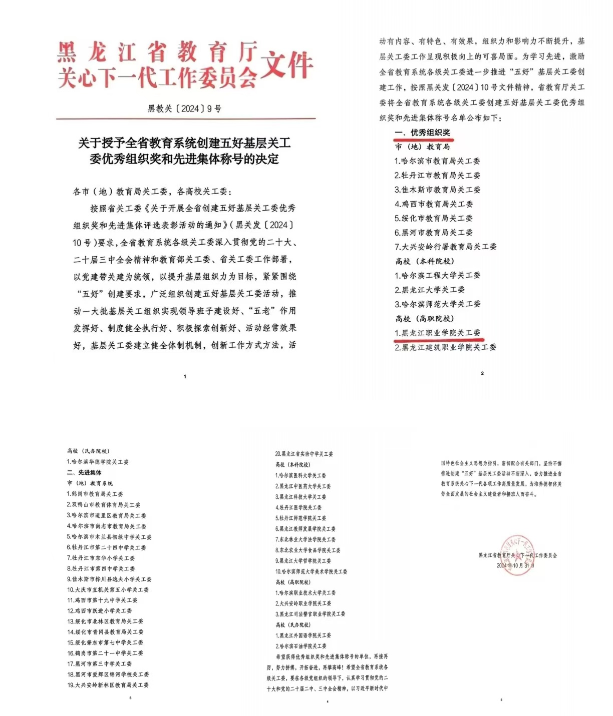 近日,省教育厅关工委先后下发《关于授予全省教育系统创建五好基层关工委优秀组织奖和先进集体称号的决定》和《黑龙江省教育厅关工委关于公布2024年 “读懂中国”活动获奖名单的通知》,贝博官网关工委在两项活动中表现突出,喜获佳绩。