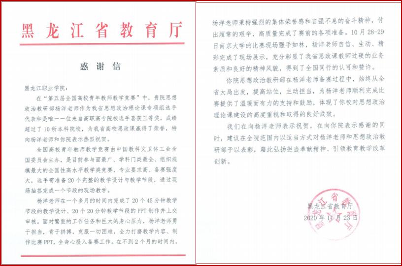 担当为责,塑造高尚之师。学院教师除了承担繁重的教学任务,还出色完成了学校“双高”建设任务;积极参与学校思政工作,发挥专业特长,指导建设课程思政示范课4门,完成校内外理论宣讲22场,学生党课教学120课时,指导9个学生社团百余次活动,指导学生“三下乡”社会实践活动10个,青春导航讲座16场。2020年省教育厅专门发函表扬贝博官网马克思主义学院杨洋老师在关键时刻勇于担当,无私奉献,为全省思政课教师赢得了荣誉。