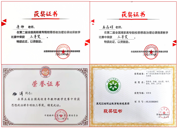 成果鉴行,彰显大思政课成效。学院教师连续5年悉心指导学生参加各类比赛,斩获累累硕果。获教育部奖项9项、省级奖项8项、优秀组织奖1项。培养了一批批理想信念坚定、人格健全、具有家国情怀、有责任担当的优秀学生,在各自的岗位上践行工匠精神,贡献自己的青春热血,彰显龙职学生“自强有为、兴业报国”的志向与担当,为社会进步注入源源不断的活力与希望。