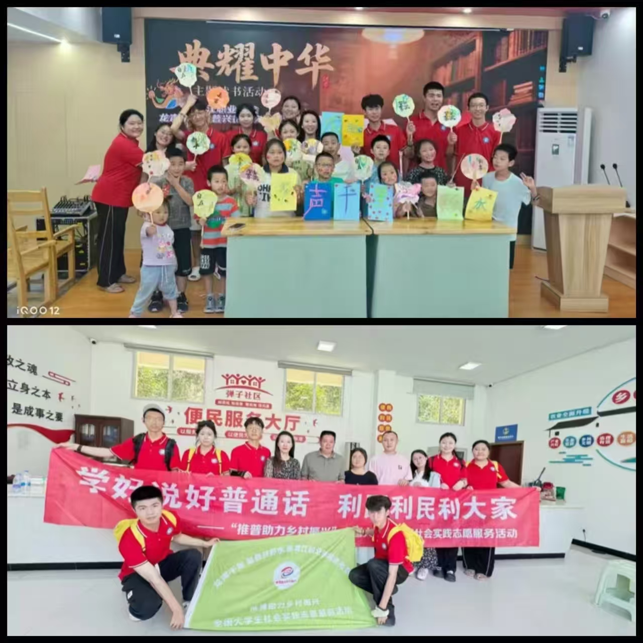 在弹子社区,实践团与社区主任座谈后,针对工作人员普通话短板开展场景教学,模拟办事窗口演练;在五湖社区托管班,用国家通用语言平台“普通话小镇”APP进行普通话发音实训,AI技术与诗人跨越时空对话。“典耀中华”汇演上,孩子们字正腔圆齐诵《少年中国说》,立志要"为中华崛起读书"点燃爱国情怀。活动融合非遗漆扇绘制等文化载体,构建"数字推普+经典传承"新模式。