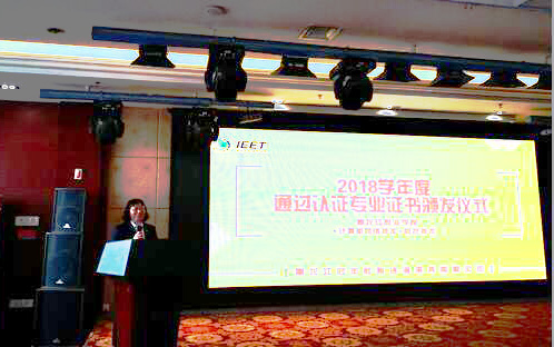 “2018学年度通过认证专业证书颁发仪式”由IEET认证委员会秘书长及执行长吕良正博士主持,吕良正博士亲自为两个专业颁发了国际工程技术教育认证(TAC-AD)证书,数控技术专业周延昌老师、计算机网络技术专业曹立志老师代表专业团队领取了证书,教务处邹洪波副处长代表学校致辞。会上,曹立志老师做了专题报告,介绍了计算机网络技术开展国际工程技术教育认证的历程和经验。黑龙江省申请2019年悉尼协议认证的高职院校专业代表近百人参加了此次颁证典礼。