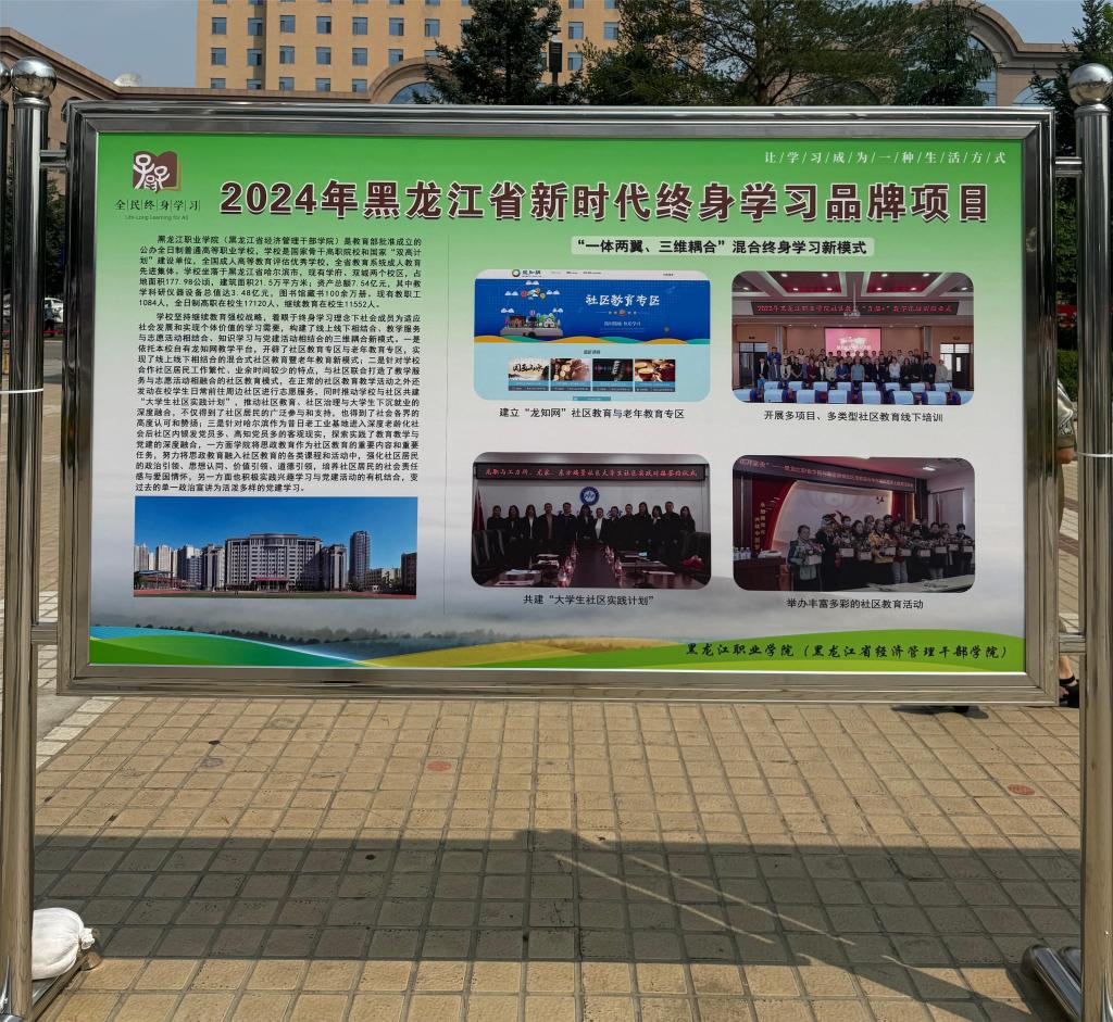 开幕式上,25位黑龙江省新时代“百姓学习之星”、24个新时代“终身学习品牌项目”受到了表彰。贝博官网报送的《“一体两翼、三维耦合”混合终身学习新模式》被评为2024年新时代“终身学习品牌项目”,是省内唯一获奖高校。与会期间,参观了黑龙江省各地终身教育成果展,作为参展单位,贝博官网以展板形式图文并茂地呈现近年来社区教育和老年教育取得的成果特色,践行了建设学习型社会的光荣使命。