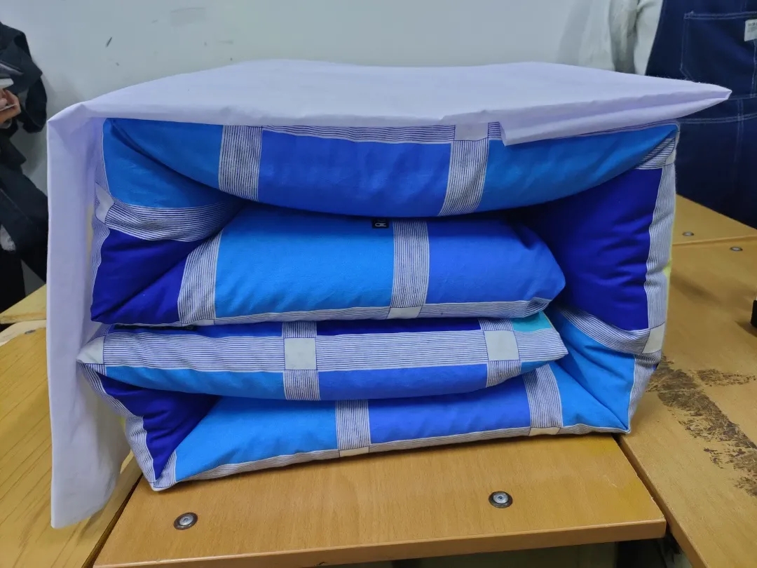 叠军被要遵循“三分叠,七分理”的原则,学长们认真讲解、手把手教学、亲自示范并讲授要领,指导新生运用“压、折、挤、掏”等基本动作来实现被子从“面包块”到“豆腐块”的华丽转变。