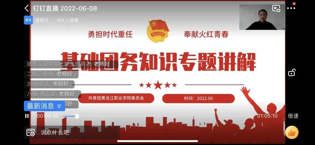 6月12日,培训班结业式在钉钉线上平台举行。校团委学生副书记常雨欣宣读了《关于准予第十六期“青年马克思主义者培养工程”暨大学生骨干培训班188名学员结业的决定》,校团委学生副书记樊泽宇宣读了《关于表彰第十六期“青年马克思主义者培养工程”暨大学生骨干培训班38名“优秀学员”的决定》。“五四青年标兵”代表张新雨、“优秀共青团干部”代表马金阳、“第十五期‘青马班’优秀学员”代表郎佳伟进行了经验分享,为新一届青马班学员分享宝贵经验。最后,校团委书记邹春雷进行了总结讲话,对培训班成功举办并圆满结束表示祝贺,并充分肯定了学员们的优秀表现和取得的成绩,就如何全方面提升学生骨干的综合素质、理论水平、专业素养和工作能力提出了具体要求。