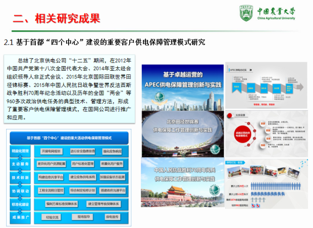 本学科主要服务于农村电网供电保障方面的科学研究,多年来教学团队在国家重点研发项目、国家自然科学基金、国家电网公司、国家能源局的支持下,开展了一系列的科学研究,解决了农村电力供给与消费中的卡脖子问题。将其中与课程相关的,“农村低压电网剩余电流保护装置研究”、“首都重大活动供电保障模式研究”、“贫困地区电力建设与生产安全质量提升”等相关项目的部分研究成果作为案例(见图1)。使学生了解实际工作中有很多需要解决的问题,理解本课程的理论知识如何解决实际复杂工程问题。更进一步认识到本学科在农村电网安全、全面增强农村供电保障能力、持续提升农村供电服务水平、服务脱贫攻坚、支持国家乡村建设行动落地等方面起到的不可替代的作用。另外,也通过国内外对比分析,突出我国在解决贫困地区问题、安全问题等方面的优越性,增强四个自信。