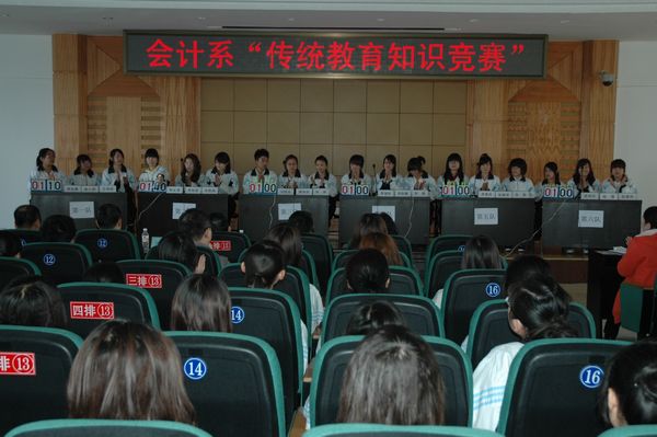 会计系于2010年4月22日下午在学院经济报告厅成功举办了“传统教育知识竞赛”。 竞赛得到了学院党委和各部门的关心和支持。学院党委副书记张玉山担任竞赛顾问;学院党委组织部、精神文明办公室、学生工作部、团委等部门领导和系党总支成员担任评委,还得到了学院办公室、工会、教务处等部门的大力支持,我系党总支对本次竞赛高度重视,多次研究竞赛的组织与实施。 竞赛当天,张玉山副书记进行了赛前动员。在动员讲话中对我系开展的此次活动给予了高度的肯定并为选手们加油、鼓气,使每一位选手个个精神抖擞。本次竞赛由我系6位辅导员为领队,组成6支代表队,每队上台队员为3名学生。比赛共分为必答题、抢答题、风险题三种形式。 在比赛过程中选手们积极思考,踊跃抢答,赛出了风格,赛出了水平。本次竞赛团体奖获奖情况为:一等奖1个代表队,二等奖2个代表队,优秀奖3个代表队;个人奖项获奖情况为:优秀选手奖1名、最佳领队奖1名、最佳组织奖1名、最佳参与奖2名。 最后系党总支书记柴越尊做了赛后总结。她首先对在此次竞赛中获奖的代表队和个人表示热烈的祝贺,对学院党委副书记张玉山同志带领各部门的领导亲临竞赛现场指导工作并担当评委,表示衷心的感谢。之后对竞赛意义进行了总结:“此次竞赛的主题是传统教育,涵盖内容非常丰富。在进行革命传统教育的同时,传承和弘扬了中华民族优秀传统知识、传统礼仪和传统美德。此次竞赛也是建立学习型党组织的需要,在学习马克思主义中国化最新成果的同时,加强思想道德建设和党的优良传统、民族优秀文化传统教育,弘扬民族精神。本次竞赛选手们既体现了会计专业认真严谨的行业作风,也展现了当代大学生的良好精神风貌和优秀素质,竞赛达到了预定目标,取得了预期效果”,之后总结了竞赛历程,对为本次竞赛辛苦筹备的各位教师提出表扬。 此次竞赛反响强烈,获得了学院有关领导和相关部门的一致好评。比赛中也锻炼了参赛者的语言表达、临场反应等多方面综合能力,增强了每一位同学的文化修养,促使每一位同学积极学习传统文化知识,弘扬中华传统美德。在日后的学习工作中,我系将继续秉承“人本、笃学”的系风,和“厚德、唯实”的系训不断严格要求自己,争取创造出更加辉煌的成绩。