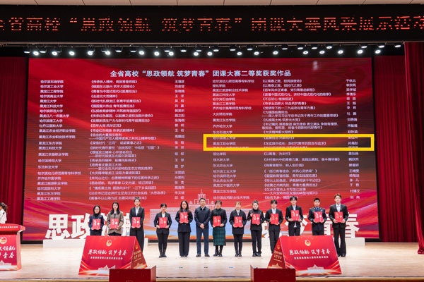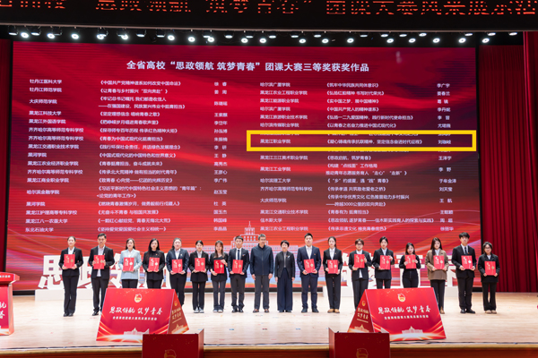 2024年12月11日,黑龙江省“思政领航 筑梦青春”团课大赛在东北林业大学科学会堂举行。大赛启动后,各高校积极响应。我院两支队伍经过校级初赛进入省级评审阶段,分别荣获教师组省级三等奖和学生组省级二等奖。学生组获奖团队由孙禹彤、孙萌、马雨竹、张宝丹四人组成,作品以实践研学为主题,展现了青年学生的蓬勃朝气与爱国情怀。教师组获奖者为团总支教师副书记刘珈岐,其作品深入阐述东北抗联精神,为青年学生提供了宝贵的精神财富和思想指引。