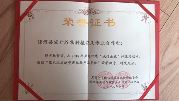在最初创业的日子里,孙宏升跑田间地头,跑产品销路。经常加班不分晨昏,忙的时候顾上休息,有的时候每天睡眠时间不足六个小时,田埂上、地头边也变成了“餐厅”。他要严把农产品质量关,更要将这滴滴汗水的“盘中餐”送到消费者手中。千难万难也消灭不了他的创业理想,强大的创新意识激励他回馈美丽家乡,千辛万苦也抵挡不住他一往无前奋斗的决心。他和父老乡亲的辛勤付出也得到了社会的认可,其中饶河县宏升谷物种植农民专业合作社在2017年黑龙江省诚信经营百姓评价活动中获得“黑龙江省百姓口碑金奖单位”荣誉称号;在2018年黑龙江省诚信企业评选活动中,合作社荣获“黑龙江省消费者信赖产品单位”荣誉称号。