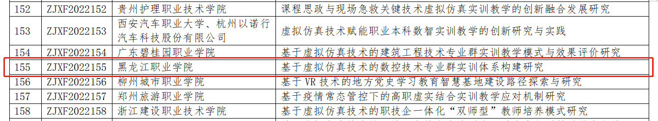 一是由贝博官网智能制造技术学院申报的《基于虚拟仿真技术的数控技术专业群实训体系构建研究》项目,获批教育部高等学校科学研究发展中心2022年度《虚拟仿真技术在职业教育教学中的创新应用》专项课题,这也是贝博官网首次立项获批教育部专项课题。