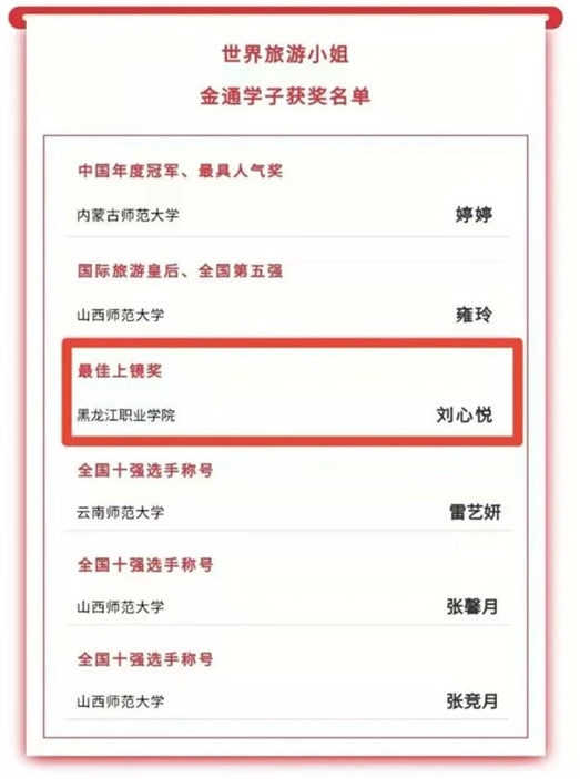 11月21日,2020年世界旅游小姐中国年度冠军总决赛在长沙铜官窑隆重举行。来自全国20个赛区的60名选手角逐中国旅游小姐称号,凭借自身的实力和出色的发挥,贝博官网2019级空中乘务专业学生刘心悦荣获最佳上镜奖。此前,刘心悦入选金通赛区十强选手并成功晋级世界旅游小姐总决赛,并在面试环节中通过青岛航空面试和成都航空面试。