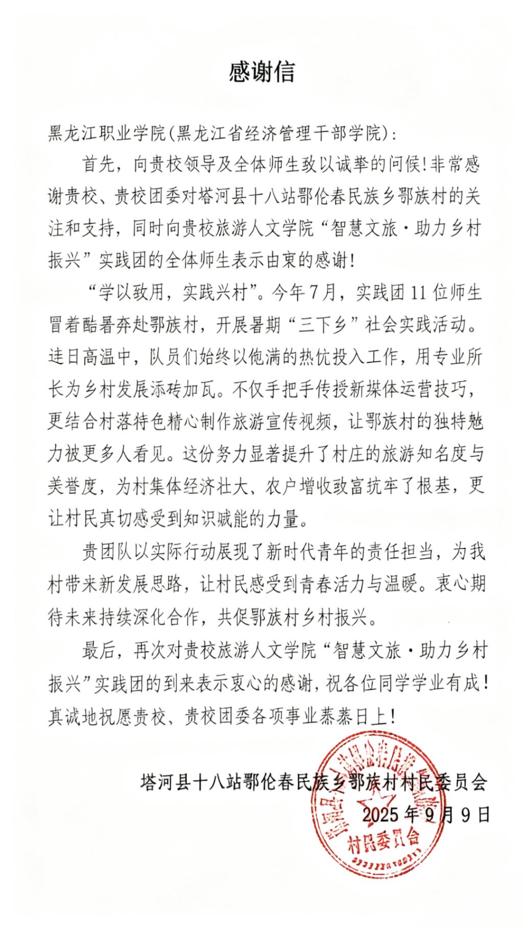 旅游人文学院暑期“三下乡”社会实践活动圆满收官,在此教师节,塔河县十八站乡政府向我院发来感谢信,高度赞扬了我院带队教师周建伦、赵戌秋、唐思尧与社会实践团的10名青年志愿者在助力塔河乡村振兴与文旅发展中所作出的积极贡献。