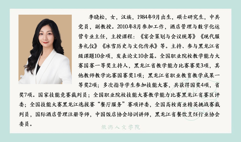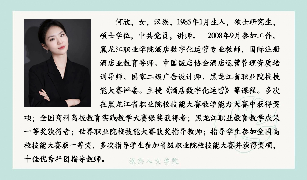 酒店管理与数字化运营专业目前拥有专任教师7人、教授1人、副教授1人、讲师 4人、助教 1人;具有硕士学位 5人。专任教师中均具有高校教师资格,双师素质教师占100%,其中 7人全部拥有国家咖啡培训师证书,3人拥有国际酒店管理注册导师证书,7人拥有 1+X 职业技能等级证书培训教师资格;骨干教师中,有“五一劳动奖章”获得者1人,原五星级酒店人力资源总监1人,原皇家加勒比邮轮员工1人。同时配备兼职教师5人,均为高星级酒店中高层管理者,拥有多年酒店运营管理实战经验,涵盖前厅、餐饮、人力资源管理等核心领域,具备极强的实践教学指导与行业资源对接能力。