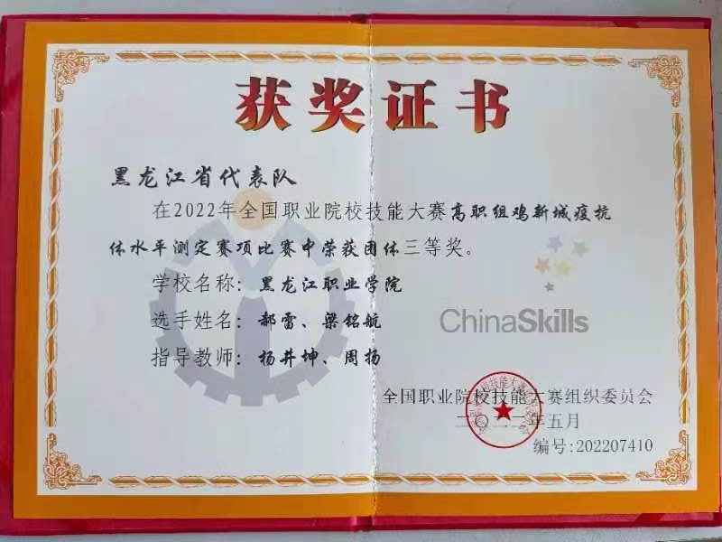 比赛分为技能考核和理论考核两部分。动物医学专业两名参赛选手在杨井坤、周扬两位老师的指导下,克服疫情影响,顶着酷暑天气,以必胜的信心坚持训练。在两天的竞赛鏖战中,不畏强手、沉着冷静、配合默契,展示了雄厚的理论功底和娴熟的技能水平,最终收获三等奖,成为黑龙江省唯一获奖的代表队。