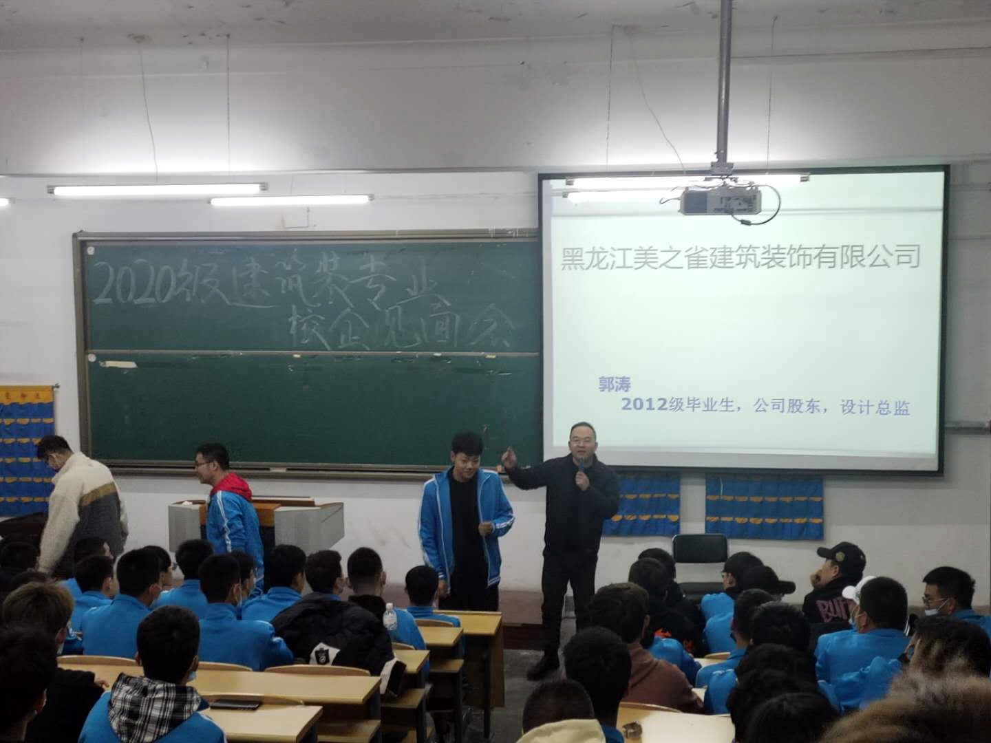 10月19日下午17点,建筑装饰工程技术专业举行了2020级新生见面会暨校企见面会。会议由建筑装饰教研室主任林泉主持,企方代表“黑龙江美之雀建筑装饰有限公司”设计总监郭涛,建筑装饰专业教师,2020级建筑装饰专业全体学生参加了本次会议。