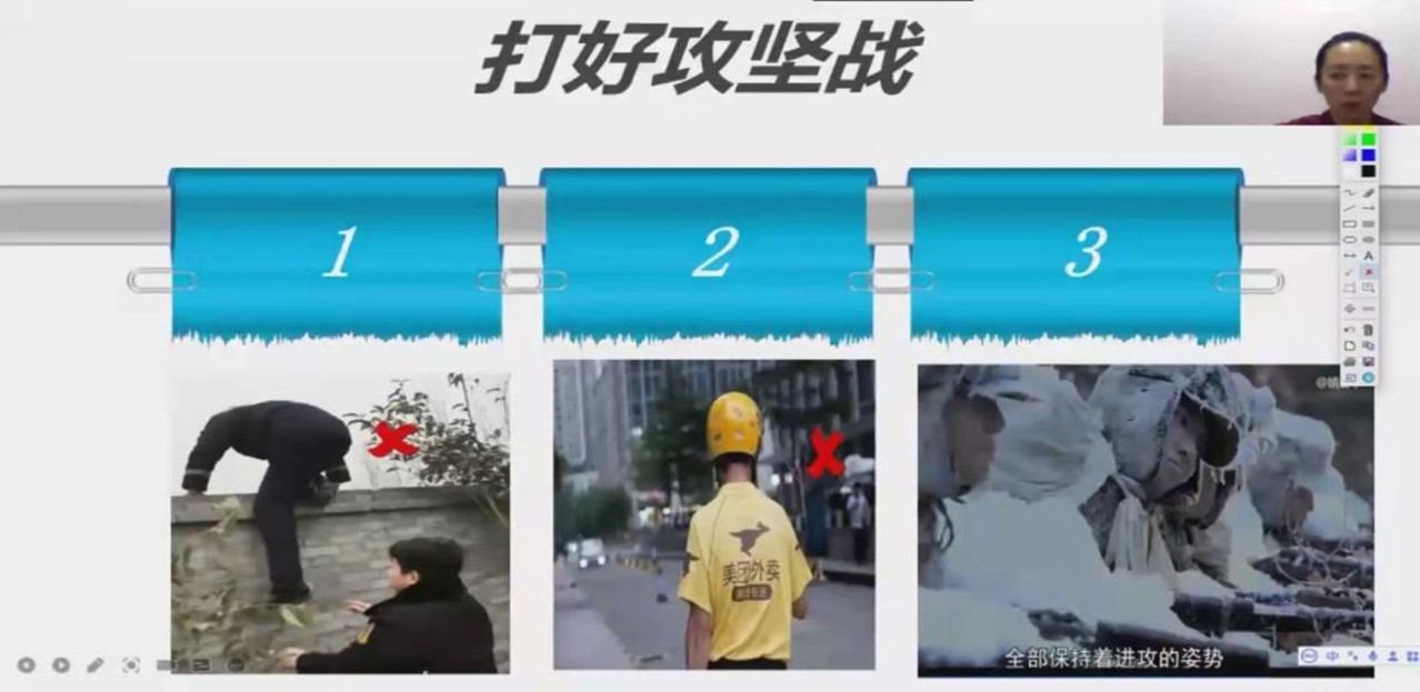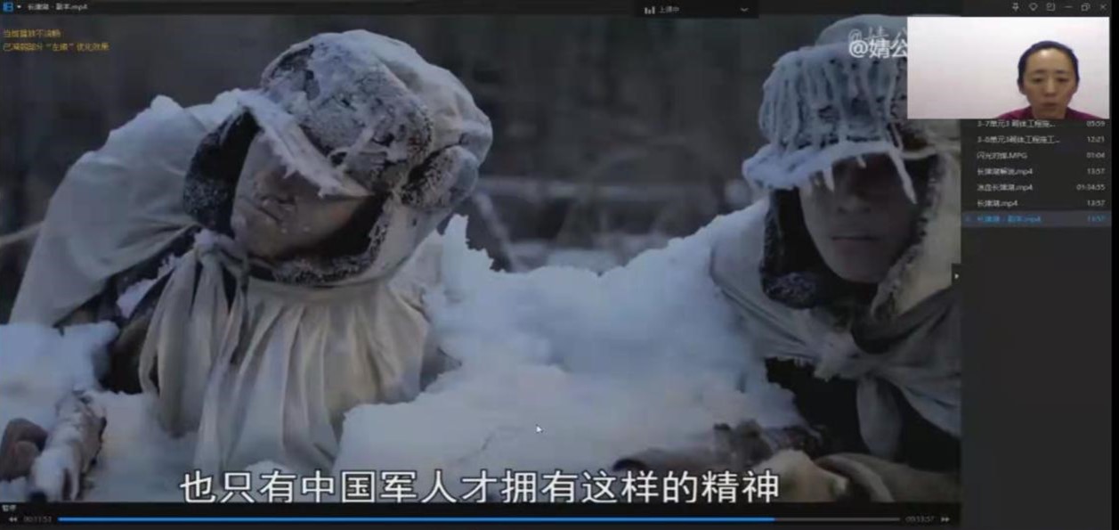 建筑工程技术教研室李秀凤老师在线上授课时为同学们播放电影《长津湖》片段,通过影片中的故事情节给学生以启发,引导同学们学习志愿军战士不畏艰难险阻,誓死保卫国家的英勇无畏精神。号召同学们面对当前疫情,要听党的指挥,遵守学校疫情防控各项规章制度,讲文明、守纪律、不翻墙,努力做一个绅士(淑女),宣传正能量,为龙职战“疫”胜利贡献力量。