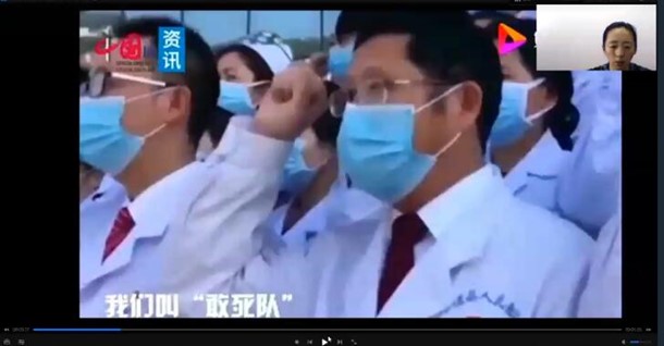 李秀凤老师在课上为同学们播放抗疫前线的系列视频。带领同学们朗诵短片中的一段话:“一辈子国家真的有几次会这样需要你,国家需要你站出来的时候你不站出来,那你就是懦夫”。让同学们理解,疫情当前,有无数逆行者在抗疫前线奋斗,作为学生的我们,也要争做最美逆行者,担负起抗疫的责任,传播正能量,遵守疫情防控的相关规定,为龙职战“疫”取得胜利做出积极贡献。