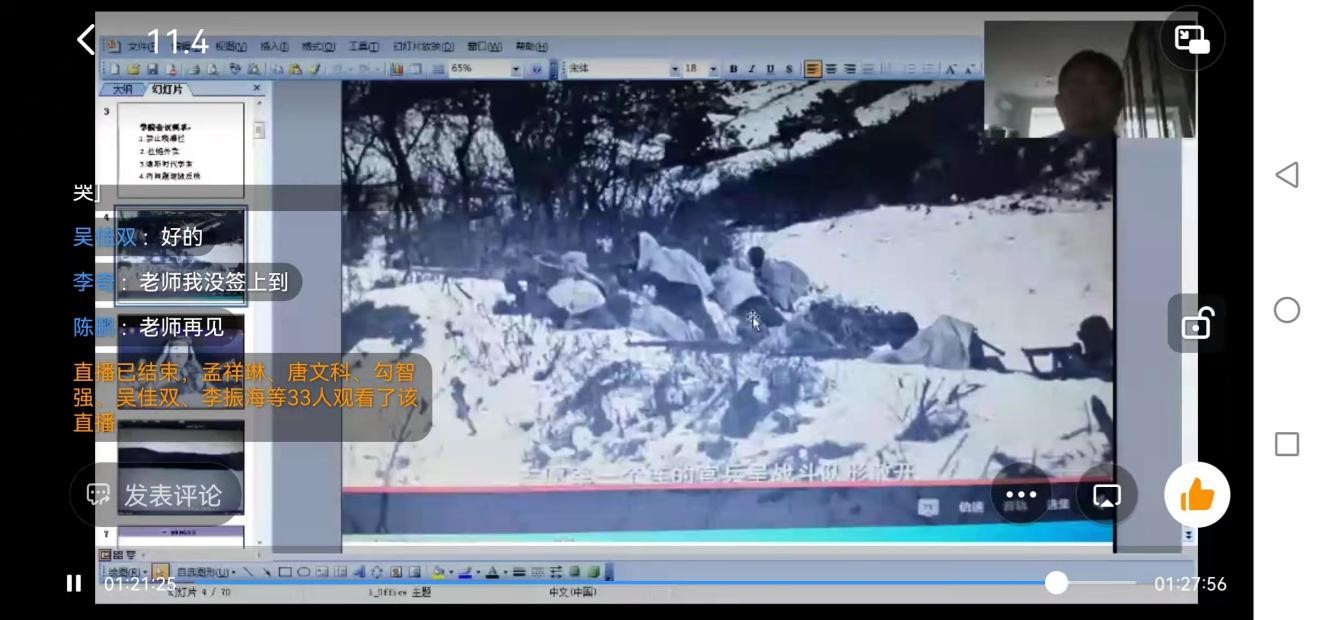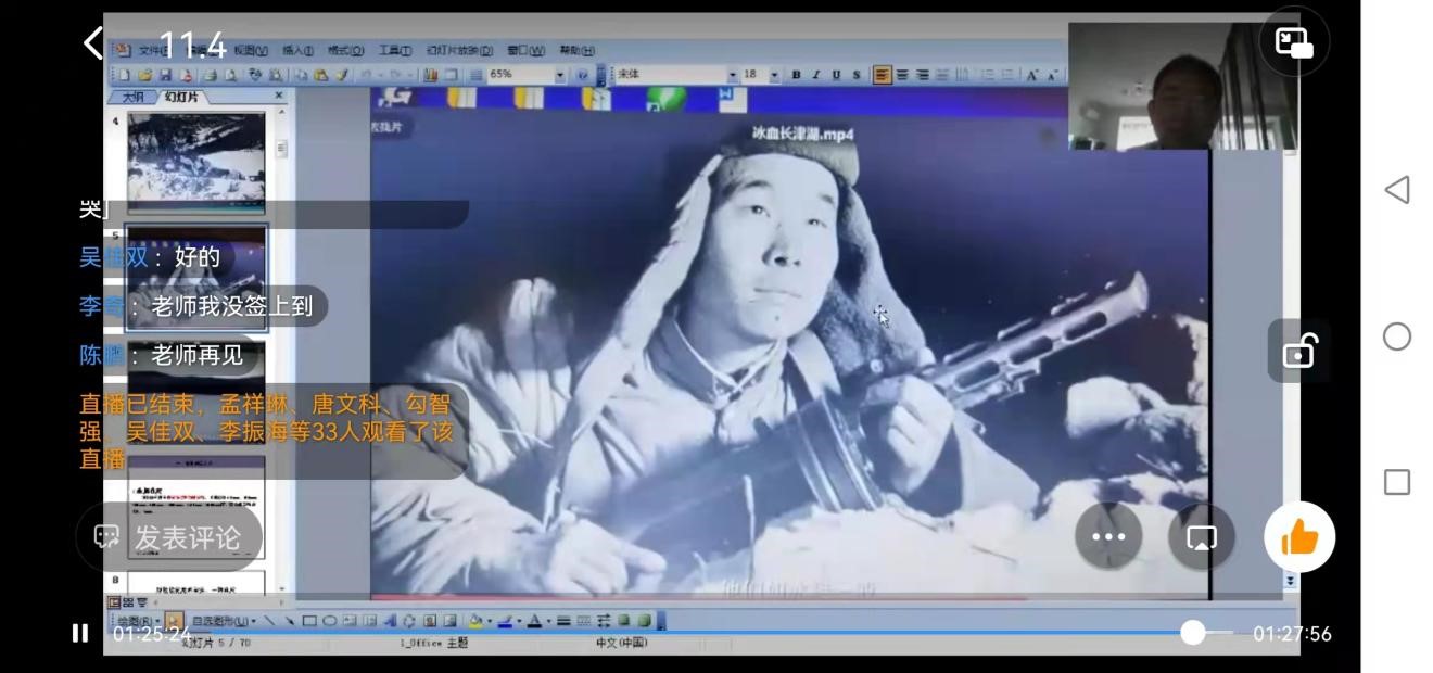 在直播时,贺东伟经常提醒同学们校外有疫情感染的危险,封校期间禁止孩子们攀爬院墙脱离学校隔离区。直播时贺老师为大家播放长津湖电影片段,志愿军为了阻击美军,在零下30度阵地埋伏冻成冰雕,为了保家卫国,为了我们今天幸福的生活牺牲一百多人,同学们还有什么理由不遵守学校的规章制度。