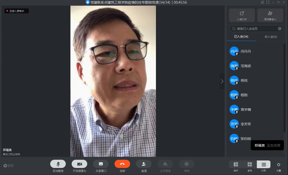 6月17日下午,学校党委委员、副校长郑福贵以“从全球抗疫——看中国特色社会主义道路”为题,给建筑工程学院全体党员讲疫情防控专题微党课。郑福贵同志分别从中国特色社会主义道路的社会动员能力及组织能力、中国共产党人民至上的执政理念、人类命运共同体、进一步坚定理想信念、如何做好自己的本职工作等五个方面来展开讲述了党课的内容。