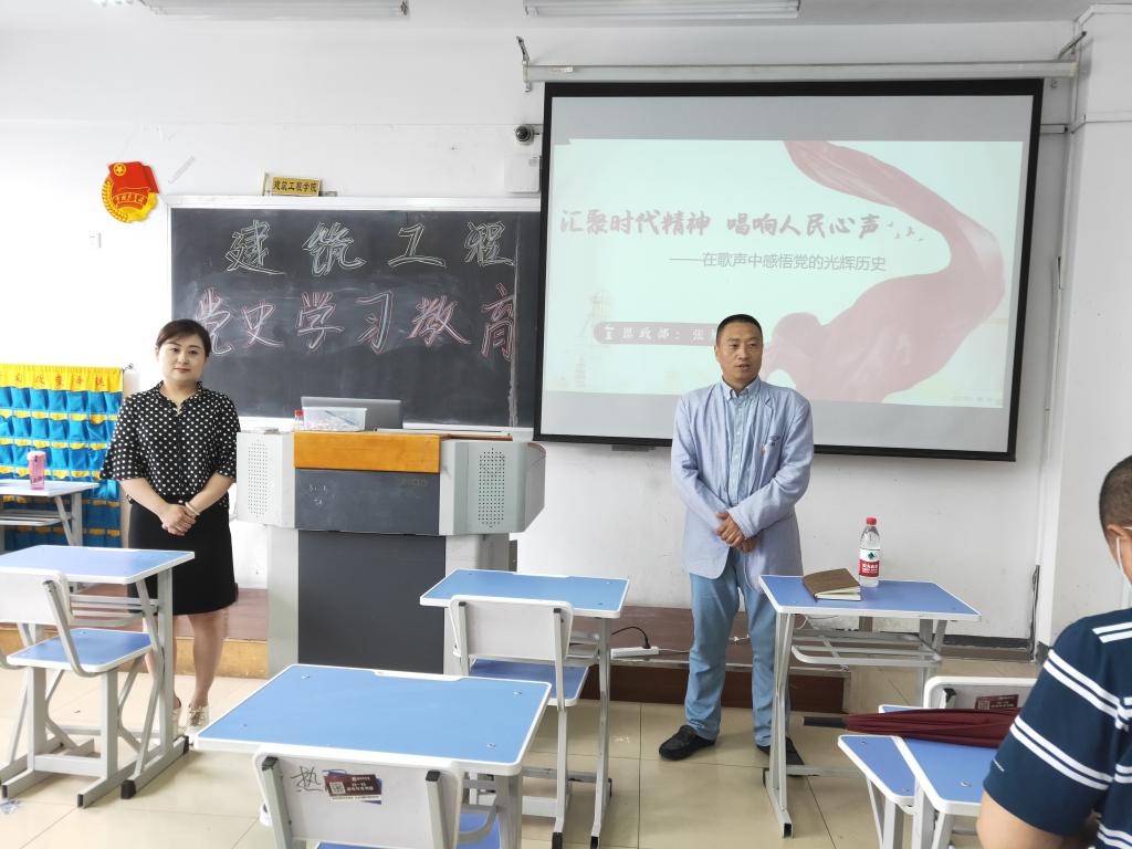 2021年6月18日下午13:30,“建筑工程学院党史学习教育专题讲座”在清华楼702教室举办,本次讲座特邀贝博官网思政部教师张旭为学院师生作了《汇聚时代精神 唱响人民心声——在歌声中感悟党的光辉历史》的专题讲座,学院无课教工、2020级学生干部及入党积极分子代表聆听讲座,讲座活动由学院党总支书记程刚主持。
