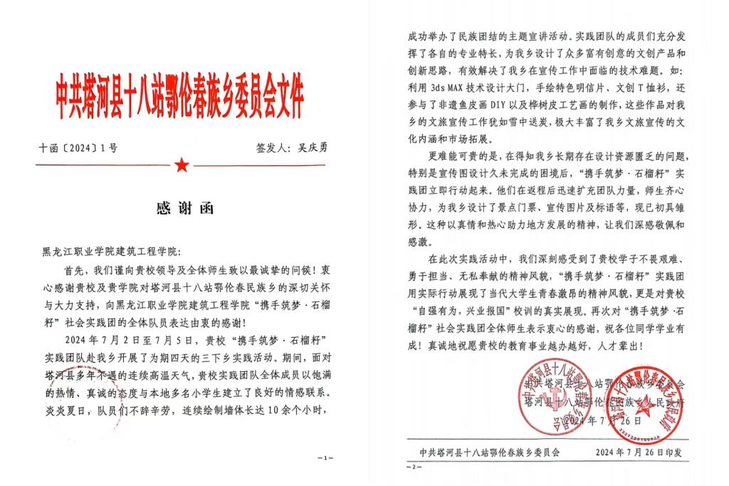 近日,BB贝博艾弗森官方网站建筑工程学院收到来自塔河县十八站鄂伦春民族乡党委和乡政府一封感谢信,信中鄂伦春民族乡对建筑工程学院“携手筑梦·石榴籽”社会实践团在当地的服务奉献和技术支持表示衷心感谢。