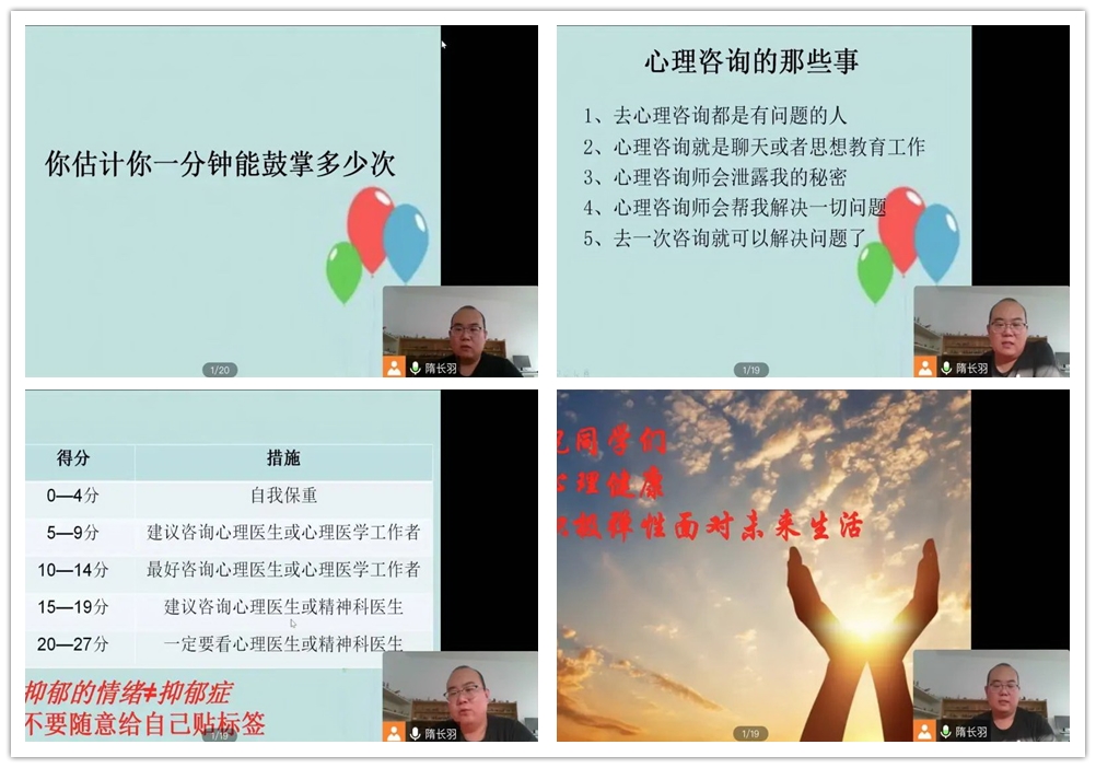隋老师首先对贝博官网心理咨询中心的建设概况、心理教师队伍师资力量、心理中心服务内容、服务形式、联系方式进行了全面的介绍。随后通过“你一分钟能鼓掌多少次”的心理测试与学生开启互动,测试的结果可以反馈出学生习得性问题,借此话题勉励学生跳出舒适圈,尤其在眼下疫情常态化的社会背景下,学生居家时间较长,个人行为难免会变得慵懒随性,但是作为新时代的大学生,应该主动提升自我约束力,以高标准严格要求自己言行。本次讲座着重讲述了大学生常见的心理问题,包括入学适应问题、学业问题、人际关系问题、恋爱和性的问题、情绪问题、就业问题、神经症问题。在讲解过程中以实际工作案例和趣味性实验相结合,学生们听起来专心致志、兴趣盎然。隋老师提醒学生一旦发现有上述问题可与心理中心联系,同时也不要自我诊断,更不要对心理问题抱有刻板偏见,心理问题是普遍性的问题,我们应该正式它而不是回避它。最后,隋老师讲解了关于心理咨询的常见性问题,提醒学生们要时刻关注自身心理健康,也祝愿广大同学们能够积极弹性的面对未来生活!