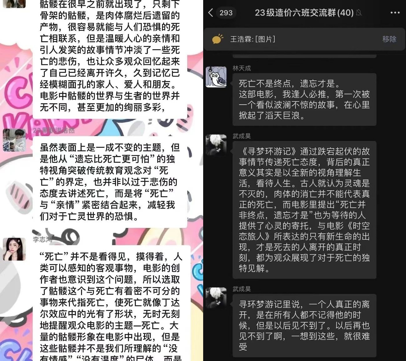 本次活动组织同学们观看电影《寻梦环游记》,影片讲述主人公米格在追逐音乐梦想的道路上,机遇巧合来到灵亡世界,遇到了已故的亲人,当真实与虚幻交汇、现实与梦想交织、亲情与梦想碰撞,主人公开启了一段奇幻的逐梦冒险之旅。本电影旨在让同学们思考生命的意义,从一个温暖的故事中理解人生的价值,从而懂得敬畏生命、珍惜生命,用积极和乐观的心态来面对成长路上的困难。观影结束后,同学们自发地在班级群里开启讨论模式,纷纷表达了自己的“观后感”。