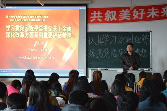 此外,我院还于3月28日15时组织全体学生观看了由黑龙江省委书记、省长等领导做出的“关于学习贯彻习近平总书记关于深化改革的系列重要讲话”工作报告的视频录像。领导们就黑龙江的政治、经济、文化、社会、生态文明等方面,深刻剖析解读了习近平总书记的重要讲话,使学生们对党的十八届三中全会的精神更加深入了解。
