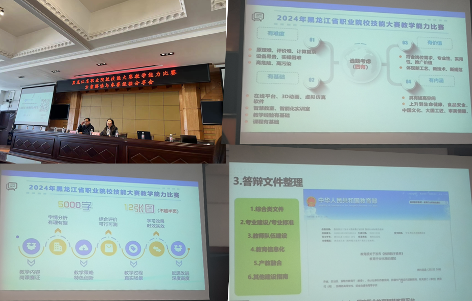 4月3日下午,习近平新时代中国特色社会主义思想概论教研室全体教师参加了学校组织的黑龙江省职业院校技能大赛教学能力比赛方案解与参赛经验分享会。会议由信息工程学院党总支书记金忠伟做方案解读、由智能制造技术学院副院长鲍敏和旅游人文学院酒店管理与数字化运营教研室主任李晓松做参赛经验分享,分享会共计4个小时。通过国赛获奖教师的无私分享,使教师们真切感受到了好成绩取得背后的艰辛,也对参赛材料的撰写、教学视频的录制,以及现场赛的备赛流程都有了全面而深入的了解,对教师们的参赛备赛提供了重要指引。