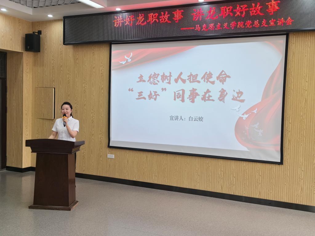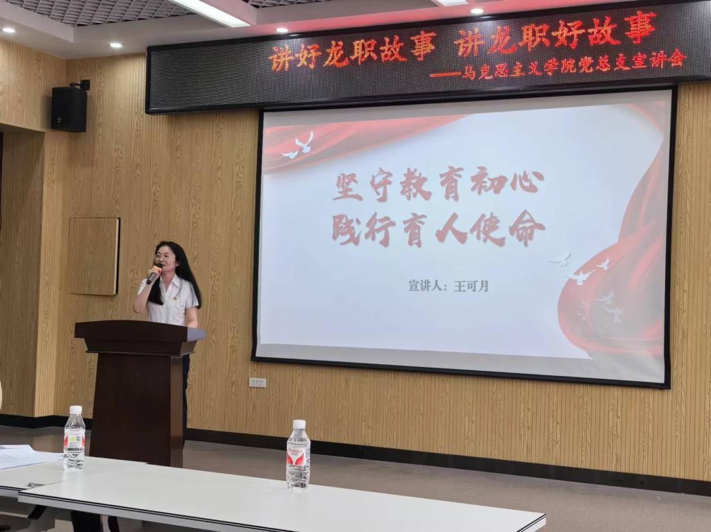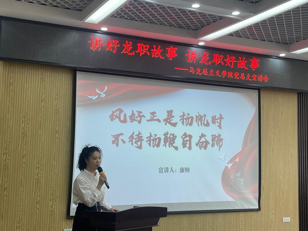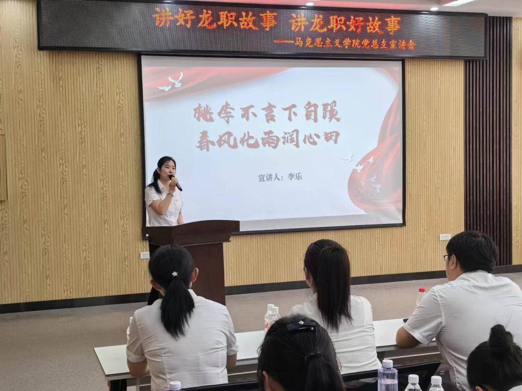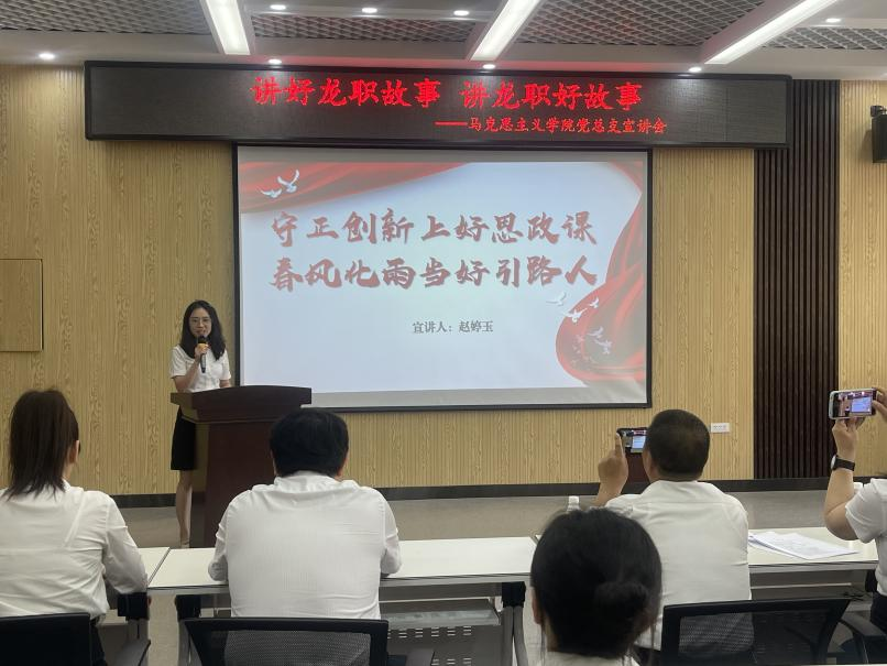为落实立德树人根本任务,深入推进“铺路石”文化建设,弘扬榜样力量,7月10日,马克思主义学院开展“讲好龙职故事,讲龙职好故事”宣讲活动。学院党总支书记程刚、综合办主任徐瑛和全体教师参加活动,活动由习近平新时代中国特色社会主义思想概论教研室主任张旭主持。